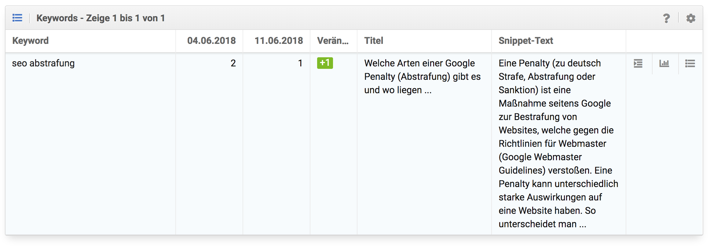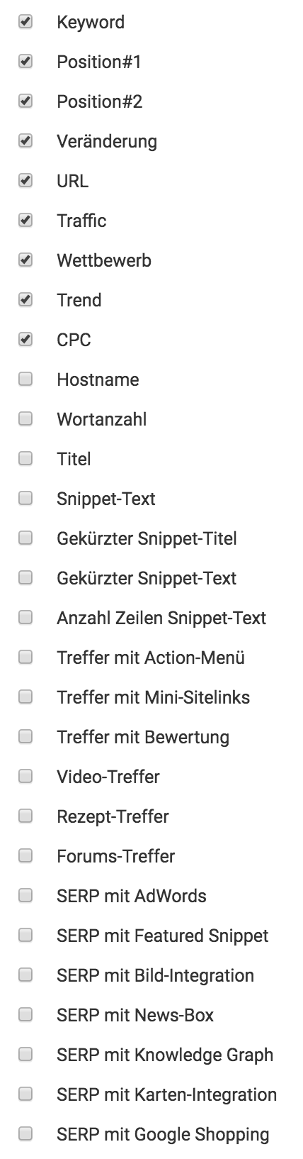 In der Tabelle zeigen wir zuerst nur einen Teil der verfügbaren Spalten an. Über das Menü bei Tabellen-Optionen kannst die Spalten anzeigen, die dich interessiert. So kann zum Beispiel der Blick auf den Titel und den Snippet-Text aus den Suchergebnissen helfen, die Veränderungen einzuordnen:
