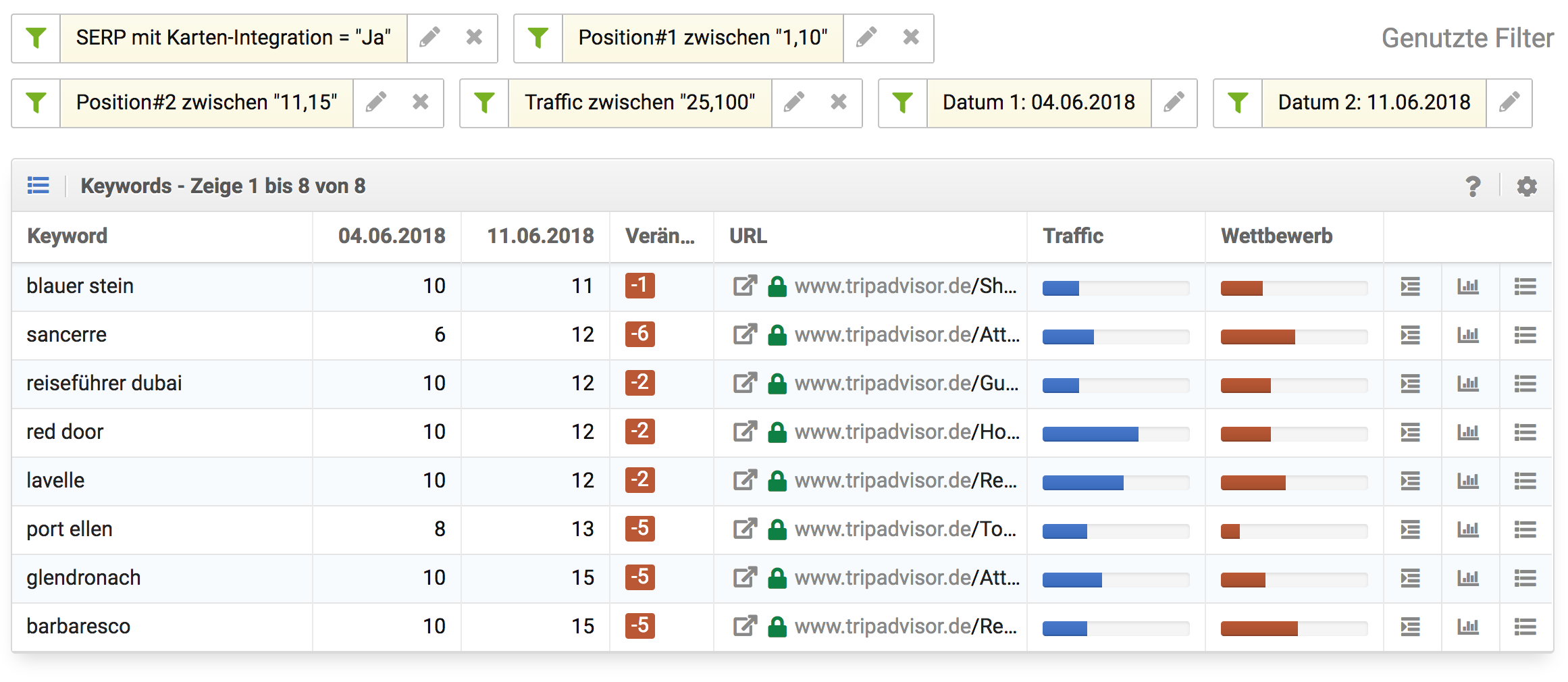 Wie in den zahlreichen anderen Toolbox-Tabellen kannst du alle 29 Spalten der Tabelle sowohl filtern als auch sortieren. Du möchtest Keywords sehen, die ein hohes Suchvolumen haben, bei denen in den SERPs eine Maps-Integration zu finden ist und deine Domain in der letzten Woche von den Top-10 auf die erste Hälfte der zweiten Seite abgerutscht ist? Mit den neuen Filtern kein Problem: