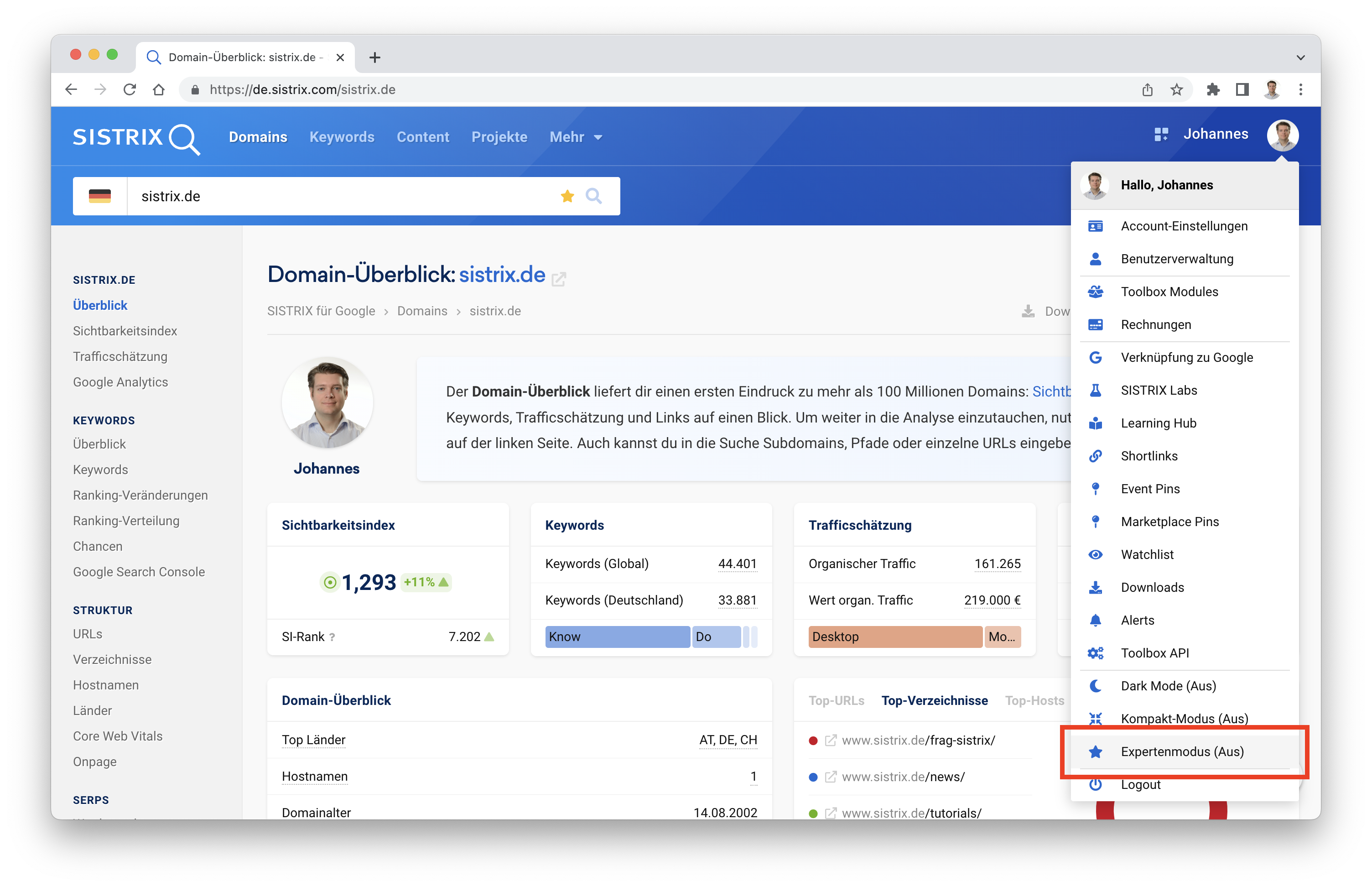 Daher gibt es nun eine Option, um die Komplexität im Interface von SISTRIX zu reduzieren. Wird im Nutzermenü (oben rechts) der Expertenmodus deaktiviert, reduzieren wir die Navigationspunkte auf die relevantesten Funktionen, blenden selten genutzte Optionen aus und erläutern die aktuelle Auswertung in kurzen Worten: