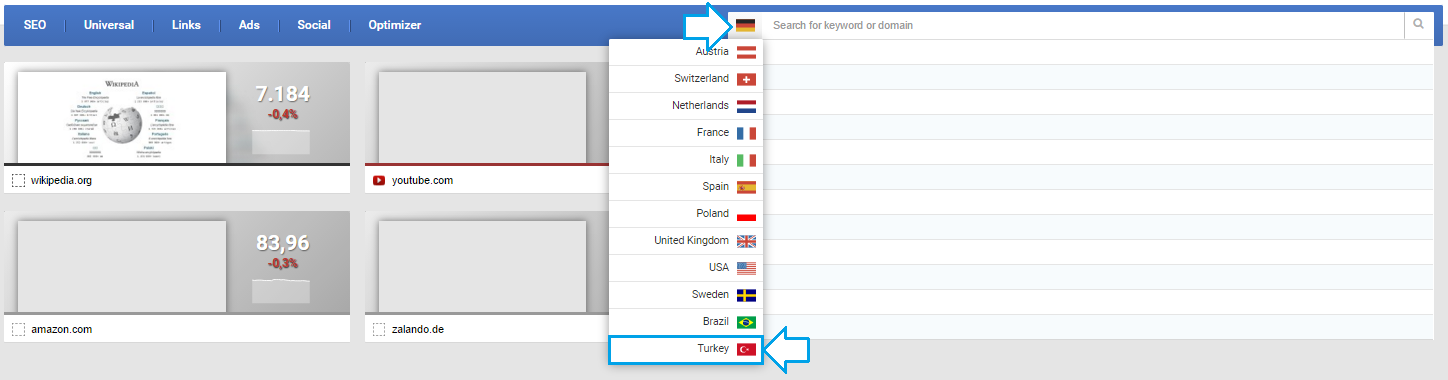 Alternativ kannst Du über tr.sistrix.com direkt in den türkischen Index springen.