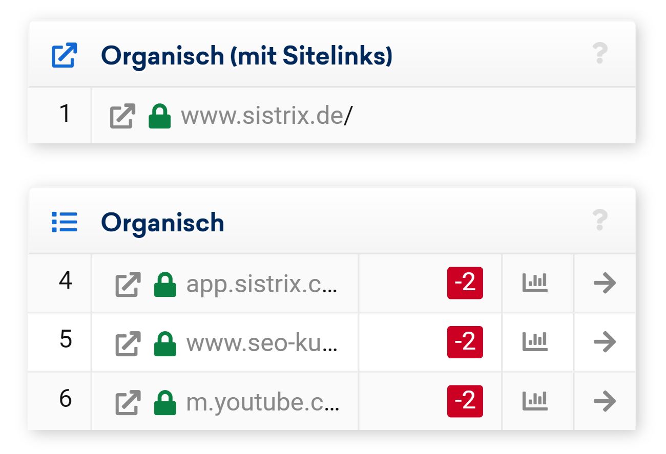 An der Behandlung organischer Google-Treffer gibt es, mit Ausnahme von Sitelinks (siehe folgender Absatz), keine Änderungen. Die meisten der jetzt ausgewerteten Treffer-Typen verdrängen keine klassischen organischen Treffer sondern werden zusätzlich zu ihnen eingeblendet. Die Typen, die einen organischen Treffer verdrängen wurden auch bislang in der Toolbox schon als organischer Treffer gewertet.