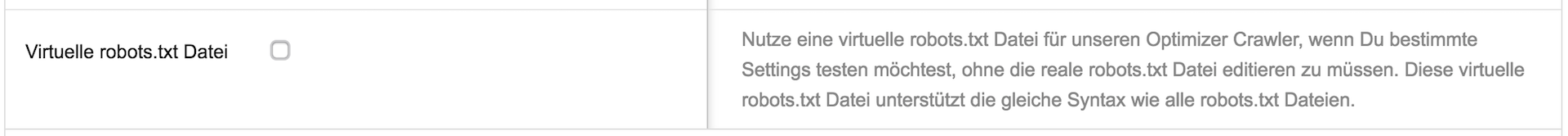 Um diese Testzwecke abzudecken und eine viel feinere Abstimmung des Crawlverhaltens für das eigene Projekt zu ermöglichen, ist es jetzt im Optimizer möglich, eine virtuelle robots.txt Datei zu aktivieren und zu befüllen.