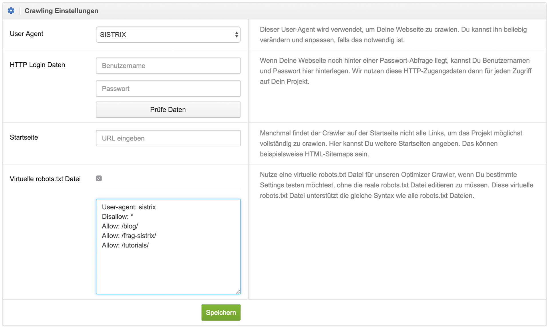 In jedem Projekt kannst Du jetzt unter „Projekt-Einstellungen > Crawler“, in der Box zu den crawling Einstellungen, auswählen, ob eine virtuelle robots.txt Datei, anstelle der realen Datei, genutzt werden soll.