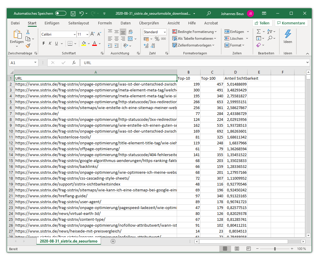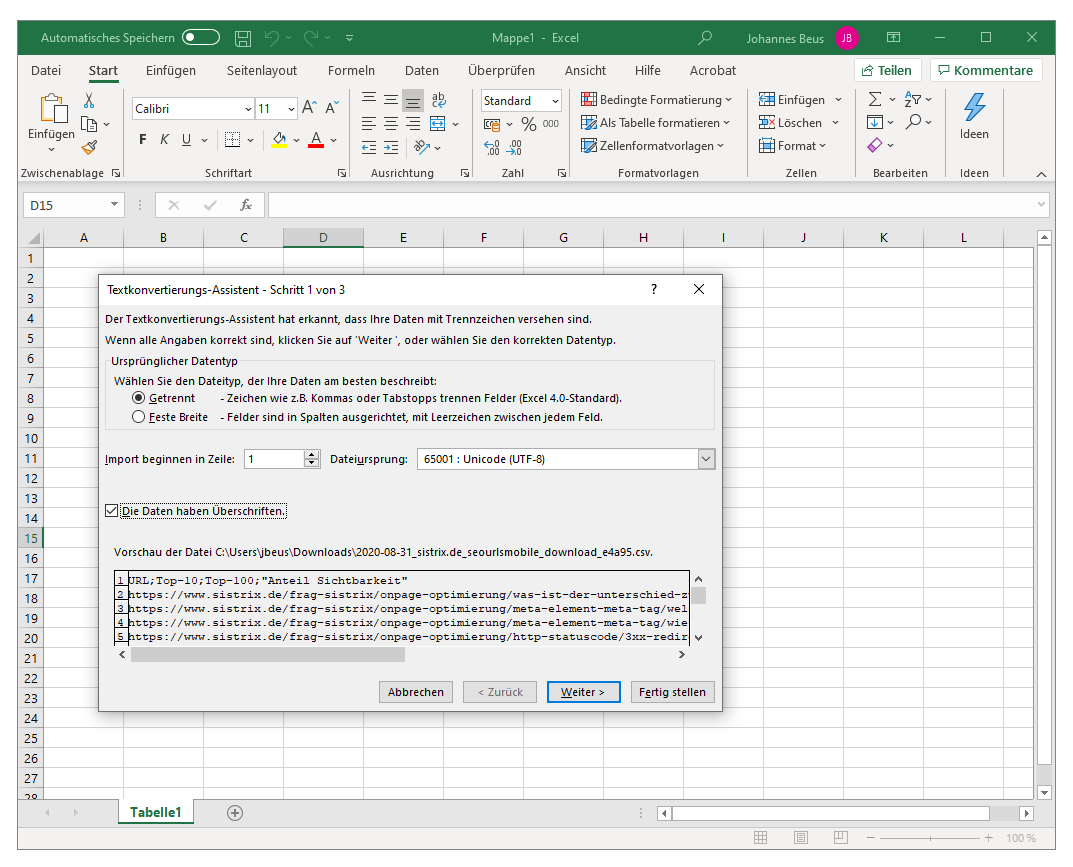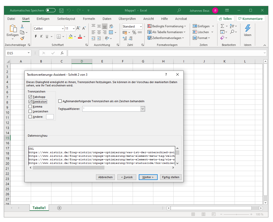 Weichen die importierten Daten in Excel von denen im Interface ab oder befindet das Trennzeichen an der falschen Stelle, kann das an den Einstellungen in deinem Tabellenverarbeitungsprogramm liegen.