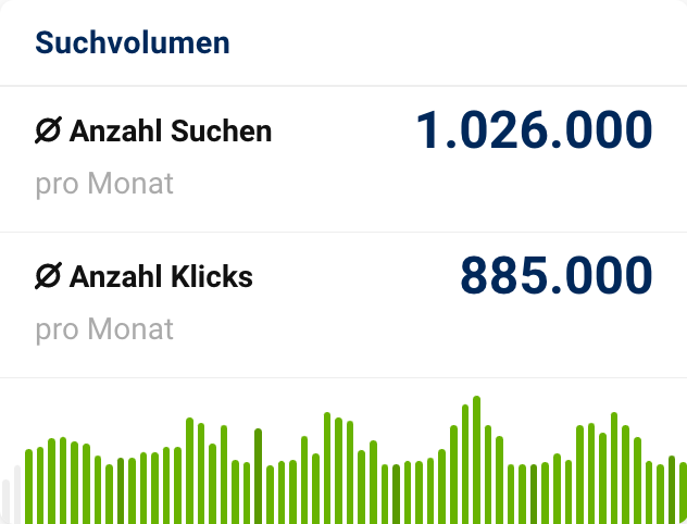 In SISTRIX unterscheiden wir zwischen dem Suchvolumen und der Anzahl der daraus resultierenden Klicks. Denn nicht jede Suche führt auch zu einem Klick auf einen organischen Treffer. In wenigen Fällen sind es mehr, meistens aber weniger, weil zum Beispiel auf eine Anzeige geklickt wurde oder die Frage in einem Featured Snippet beantwortet wurde.