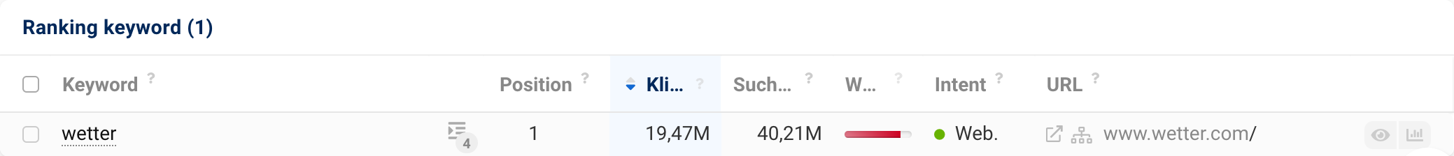 Klicks sind als Metrik deshalb so interessant, weil sie nicht nur ausdrücken, wie oft nach einen Keyword gesucht wird, sondern auch wieviel Traffic du am Ende durch ein passendes Ranking auf deiner Seite bekommen kannst. Bei den Rankings einer Domain findest du darum neben der Position und dem Suchvolumen auch eine Angabe zu den Klicks.