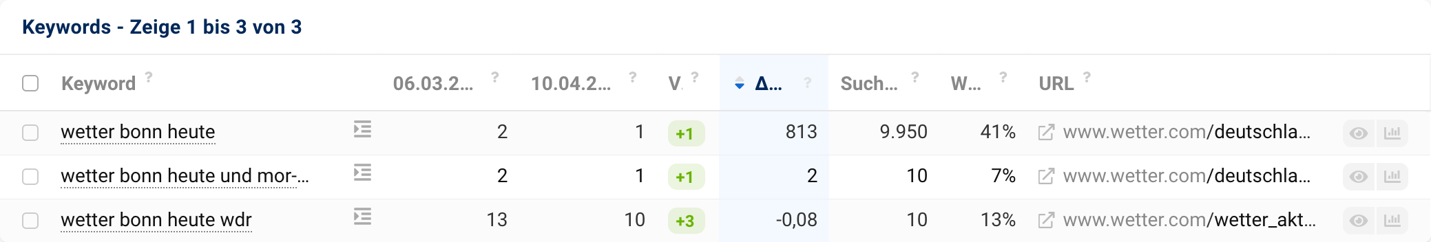 Schaust du dir die Ranking-Veränderungen einer Domain an, findest du eine Variante zu diesem Wert. Hinter den beiden Tagen und der Positions-Veränderung findest du die Spalte „ΔKlicks„. Der Wert zeigt dir, wie viele Klicks im betreffenden Zeitraum für ein Ranking verloren gingen oder hinzugewonnen werden konnten.