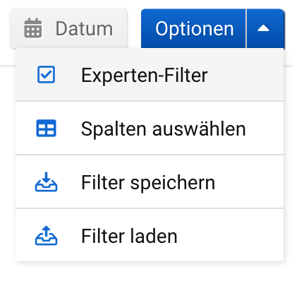Die Filter-Funktionen in der Toolbox sind so konzipiert, dass sie für die allermeisten Anwendungsfälle einfach und schnell zum gewünschten Ergebnis führen. Für die restlichen Fälle gibt es die Experten-Filter. Diese kannst du bei den meisten Tabellen über das Optionen-Dropdown auf Höhe der Breadcrumb Navigation erreichen.