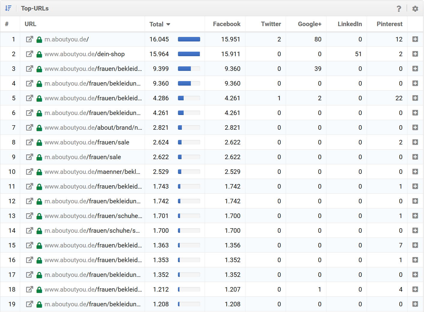 Das Plus (rechts in jeder Zeile) führt tiefer in die URL-Statistik, die die Entwicklung der URL in den Sozialen Medien darstellt.