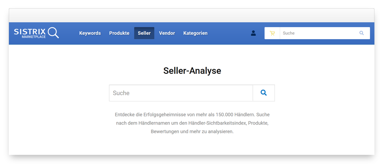 Eine Wettbewerbsanalyse kann starten, indem du über die blaue Navigation „Seller” anwählst und einen beliebigen (deinen) Händlernamen eingibst.