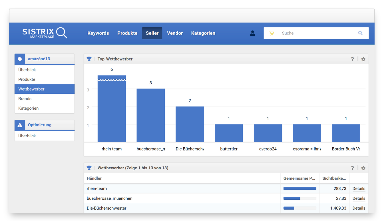 Auf Amazon gibt es eine Vielzahl an Händlern. In 2018 haben wir rund 150.000 angemeldete Merchants (Händler) auf dem Online-Marktplatz gezählt. Umso wichtiger ist es, dass Nutzer des SISTRIX Marketplace-Tools wissen, wie sie ihre nächsten Wettbewerber finden und analysieren können.