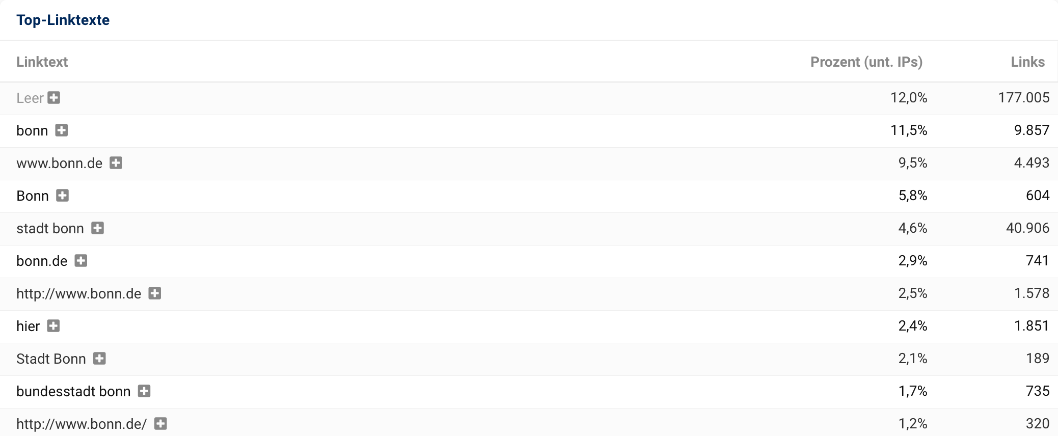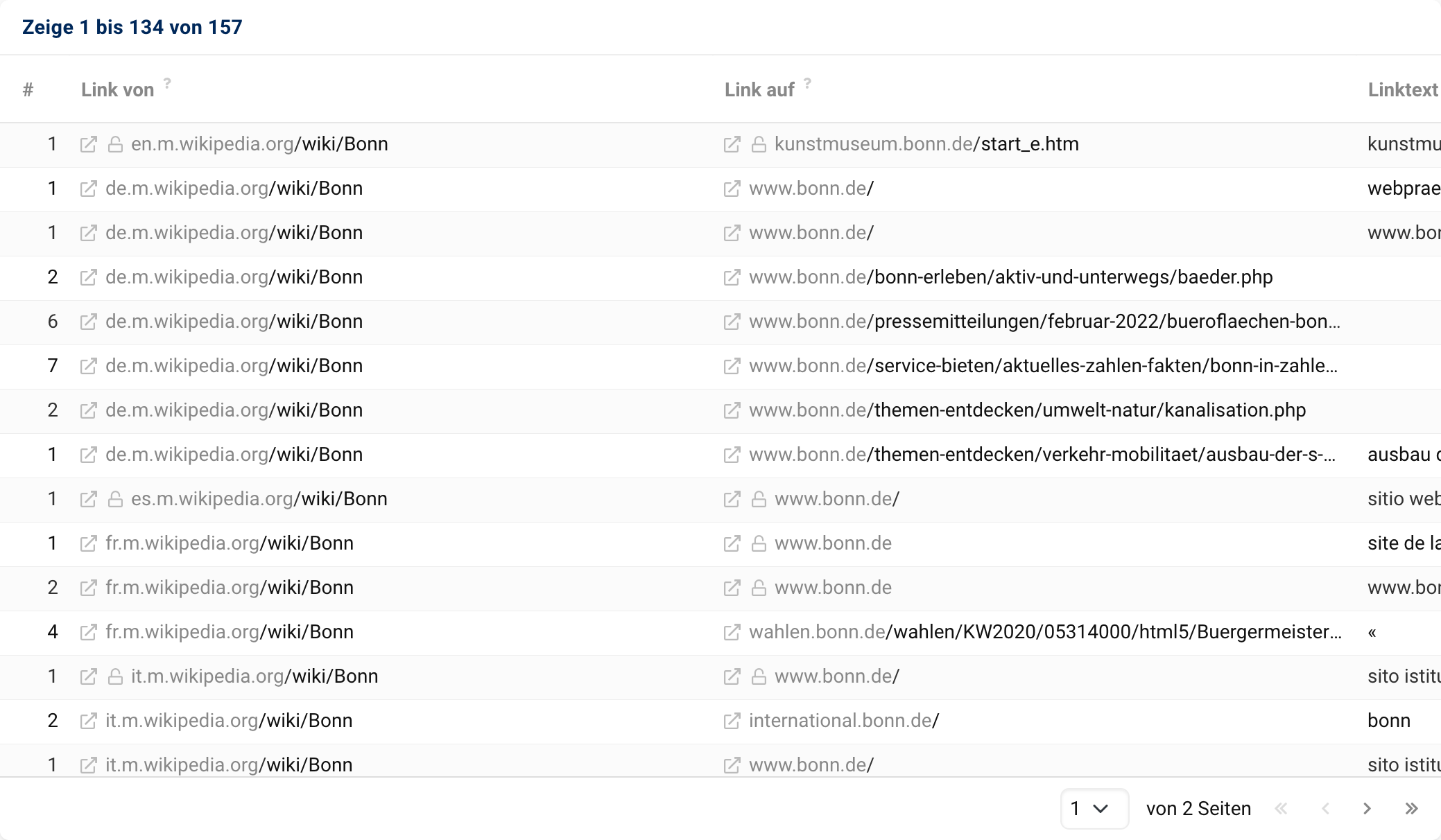 Um verdächtige Links zu finden, kannst du unter “Linktexte” nach verdächtigen Ankertexten Ausschau halten. So kannst du zum Beispiel Links mit unpassenden Money-Keywords finden. Oder bei den “Domains”, “TLDs” und “Länder” Seiten aus Regionen, die gar nicht zu deinem Angebot passen, herausstellen. Bei diesen kann es sich lohnen, einen zweiten Blick auf den Link zu werfen.