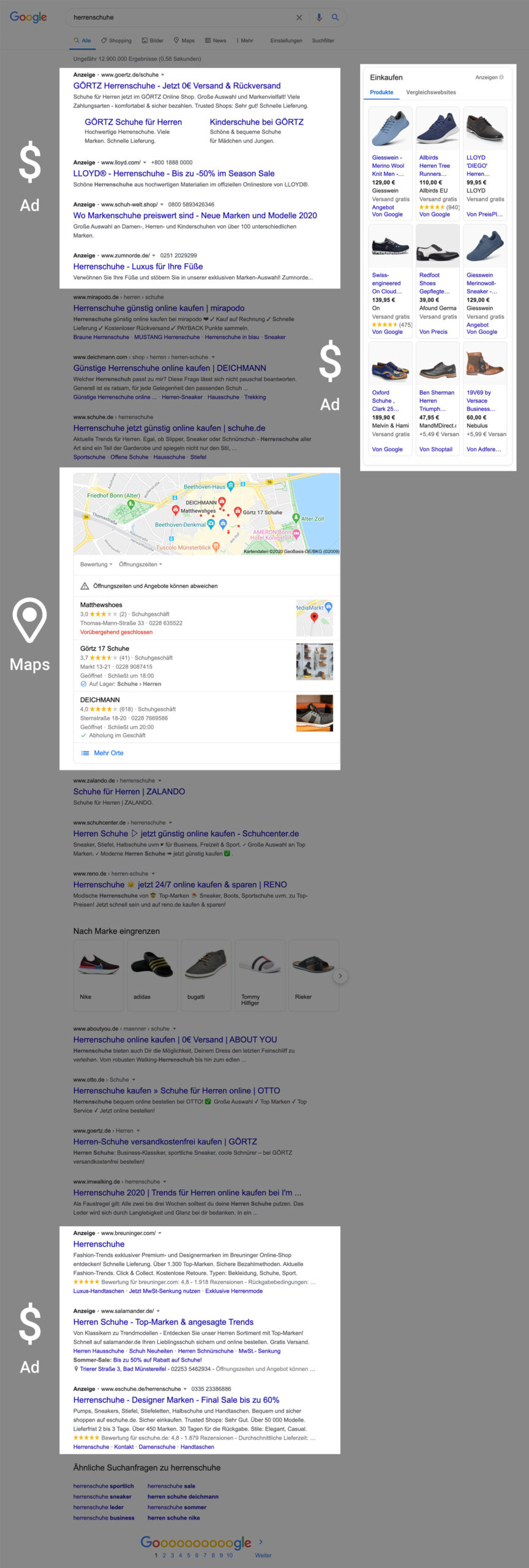 Ja. Auf einer Ergebnisseite von Google können sich weiterführende Informationen oder Fragen zu einem Thema befinden, wie die Box auf der rechten Seite sowie unterhalb der organischen Ergebnisse im obigen Bild, aber auch Werbung.
