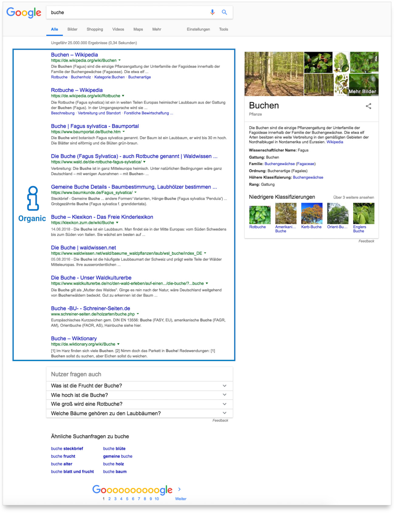 Generell zeigt Google maximal 10 organische Ergebnisse pro Ergebnisseite an. Bei einer Informationssuche (Know-Suche) nach „Buche“ kann die Suchergebnisseite folgendermaßen aussehen: