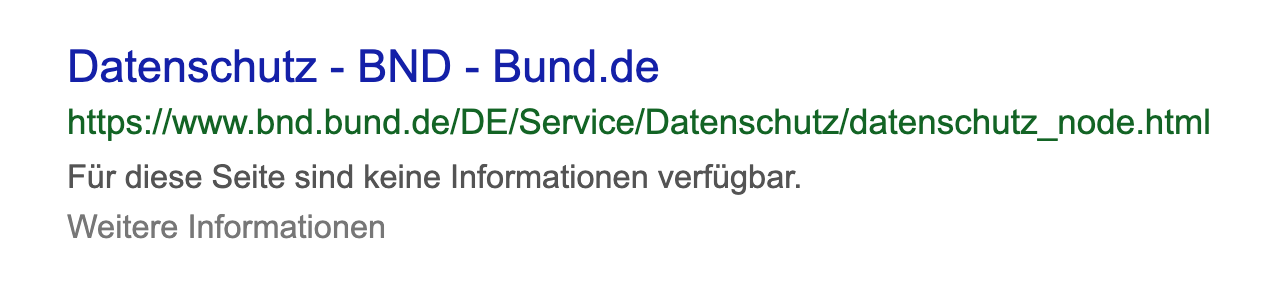 Der Inhalt der Seite ist Google aber immer noch nicht bekannt, da dieser gemäß robots.txt nicht gecrawlt und indexiert wurde. In den Ergebnissen wird dann ein „Für diese Seite sind keine Informationen verfügbar“ zusammen mit einem Link auf Googles Hilfeseite.