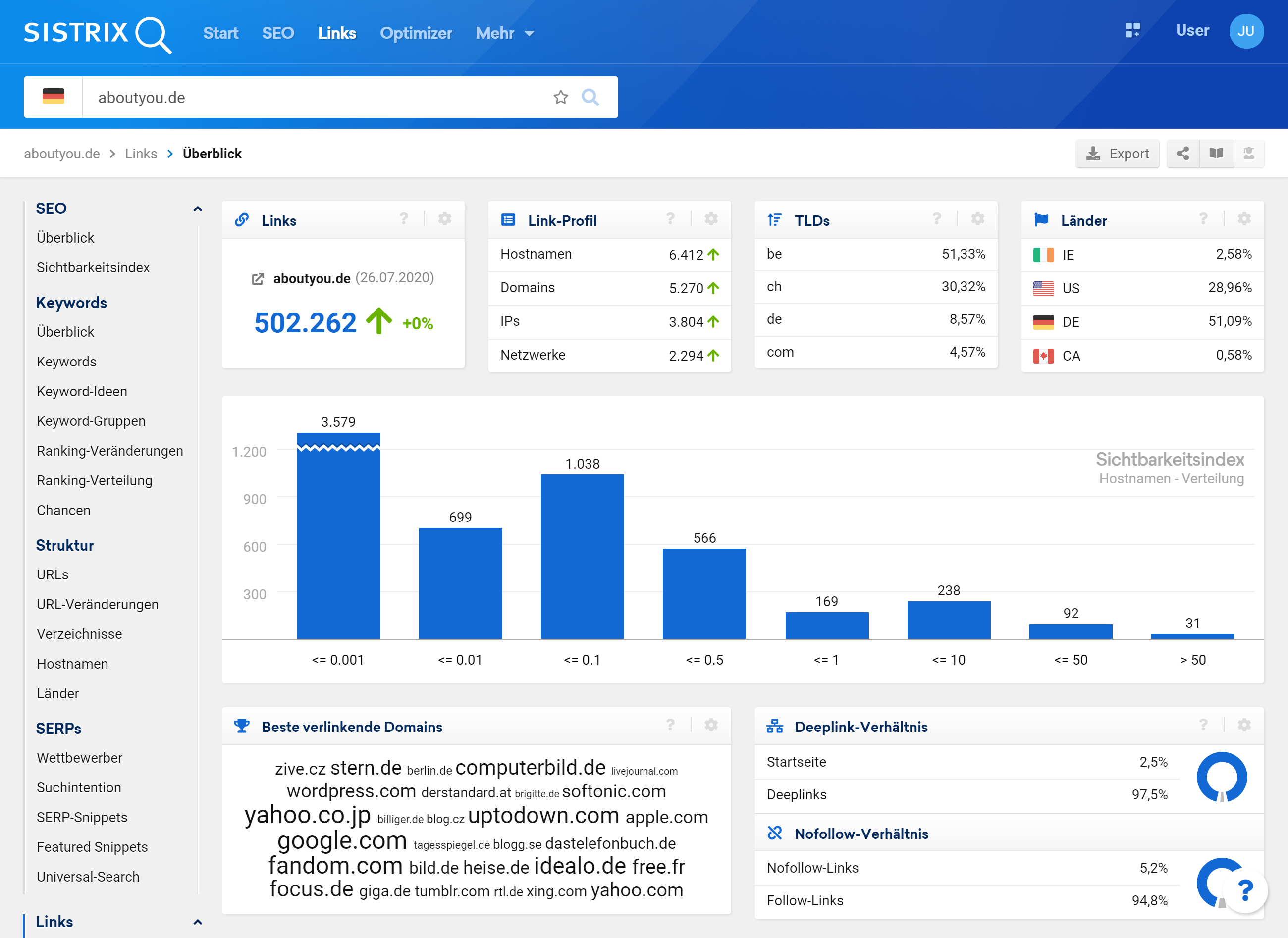 Das Backlinkprofil einer beliebigen Domain sowie einzelne Linkmetriken lassen sich im Link-Modul der SISTRIX Toolbox detailliert analysieren und auswerten: