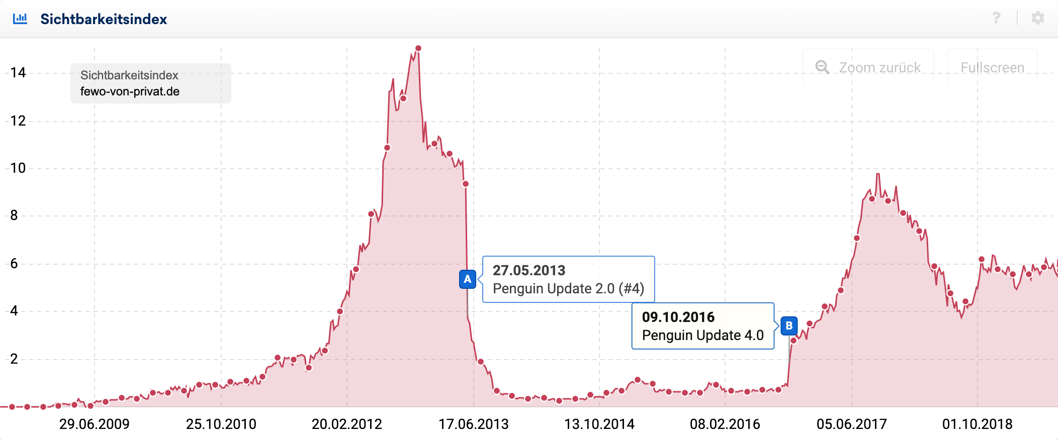 Von rund 10 Sichtbarkeitspunkten unmittelbar vor dem Penguin-Update stürzte die Domain auf etwa 0,5 Punkte ab.