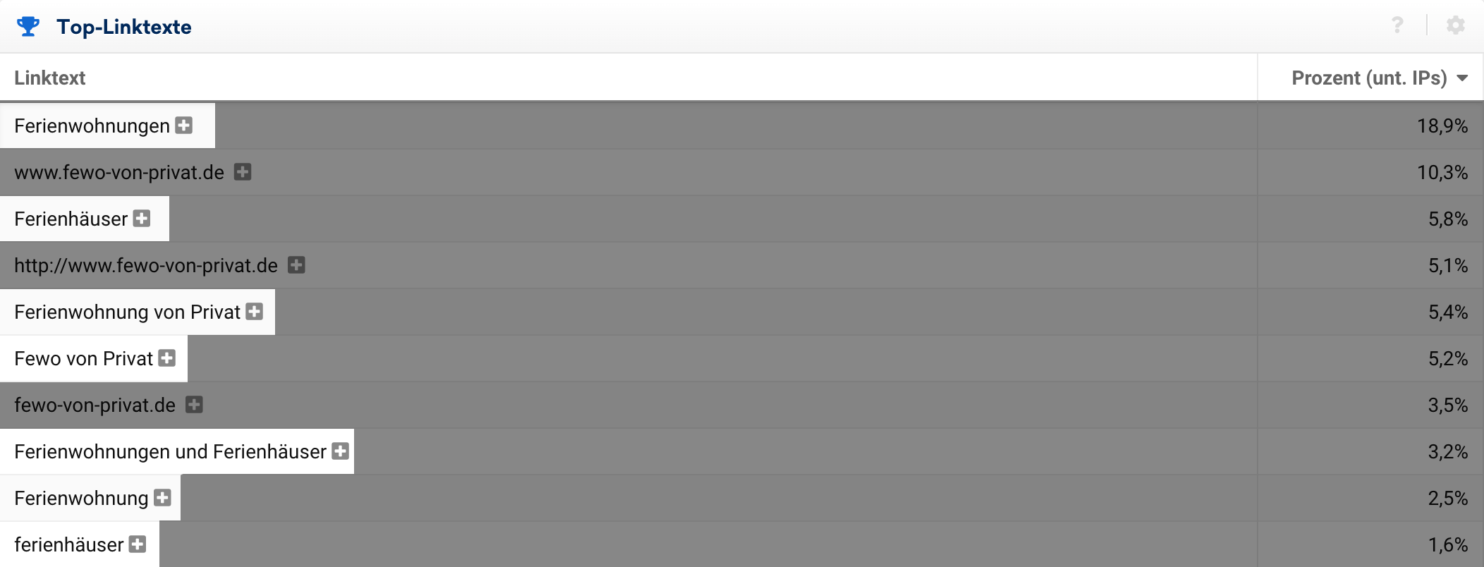 Ein unnatürliches Linkprofil weißt eine proportional überdurchschnittliche Menge an harten Linktexten im Vergleich zu natürlich entstandenen Links auf. Schauen wir uns ein Beispiel an.