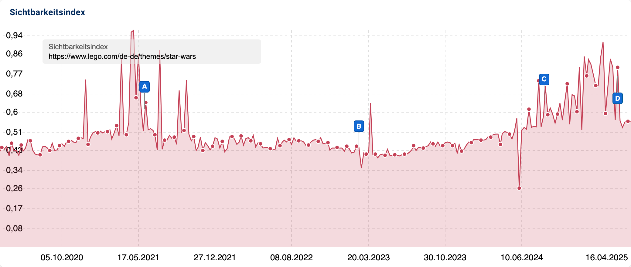 Sichtbarkeitsverlauf der LEGO Star Wars-Themenseite – stabil auf mittlerem Niveau bis Mitte 2024, danach deutliches Wachstum mit einzelnen Spitzen.
