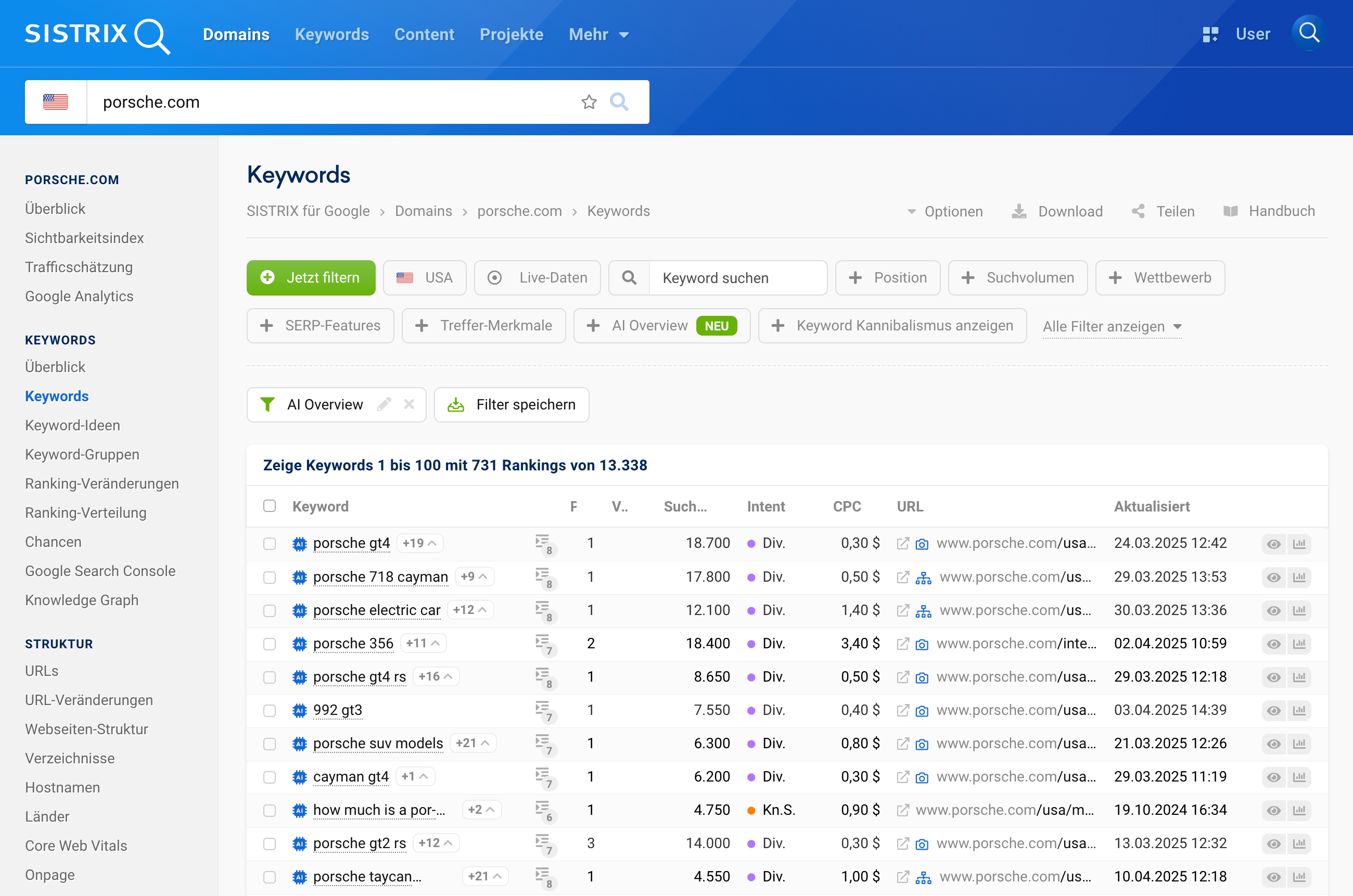 Keyword-Rankings für porsche.com mit aktivem AI Overview-Filter – zeigt Suchbegriffe mit potenzieller Integration in AI Overviews bei Google.