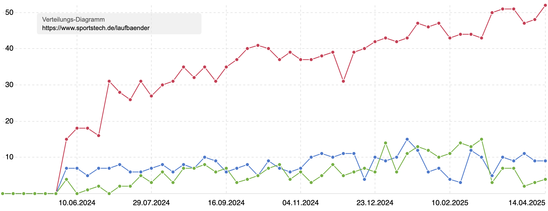 Verlauf der Rankingverteilung für sportstech.de/laufbaender – mit deutlichem Anstieg der Top-10-Rankings ab Juni 2024.