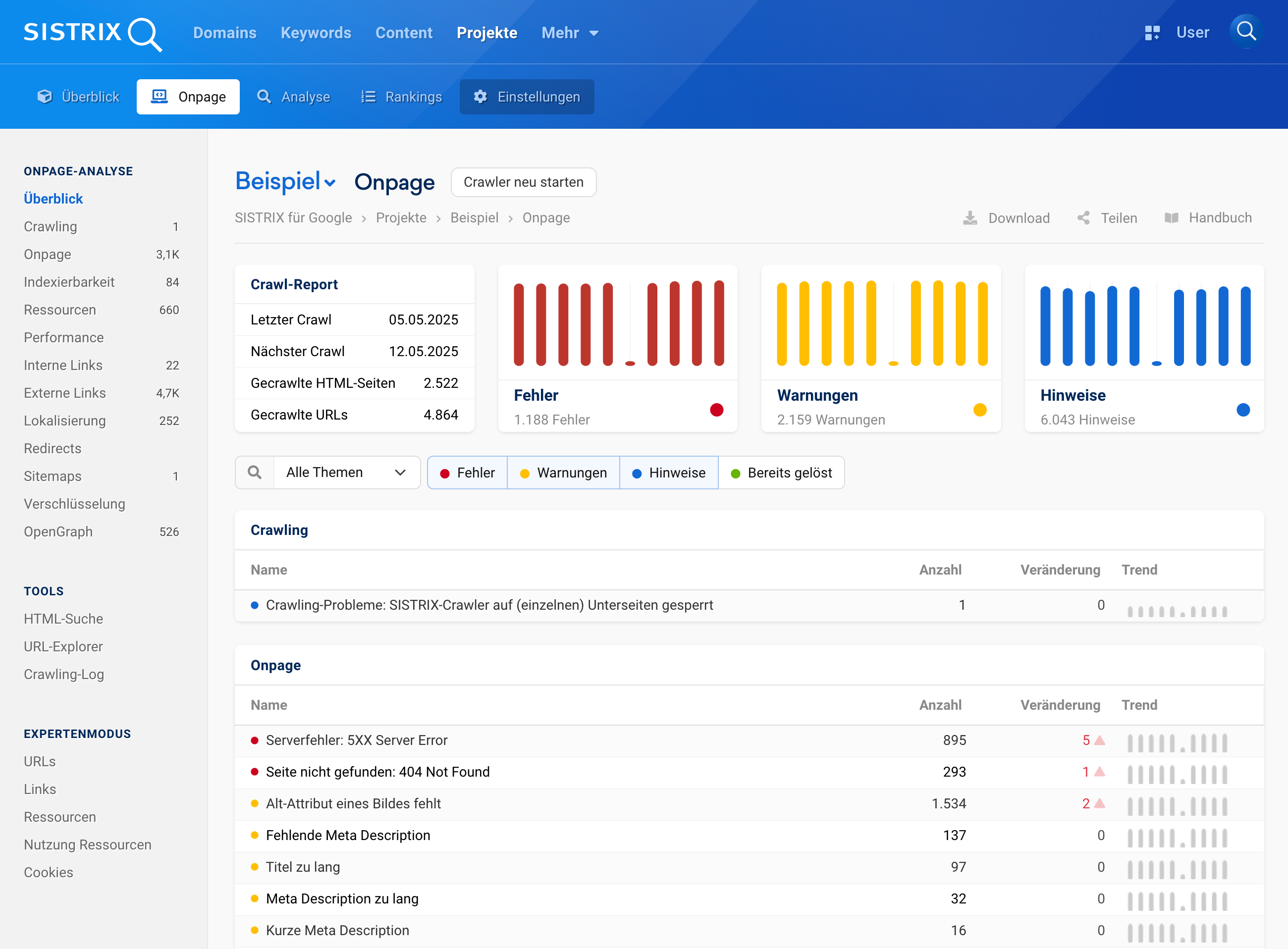 SISTRIX hilft dabei, diese technischen Voraussetzungen messbar zu machen. Mit einem Projekt kannst du Deine Website regelmäßig crawlen lassen. Das Tool zeigt dir, welche Seiten fehlerhafte Statuscodes liefern, ob Weiterleitungen korrekt funktionieren und ob Inhalte indexierbar sind. Auch Hinweise zu Ladezeiten und Struktur der Seiten bekommst du dort direkt. So erkennst Du technische Schwächen, bevor sie sich negativ auf deine Rankings auswirken.