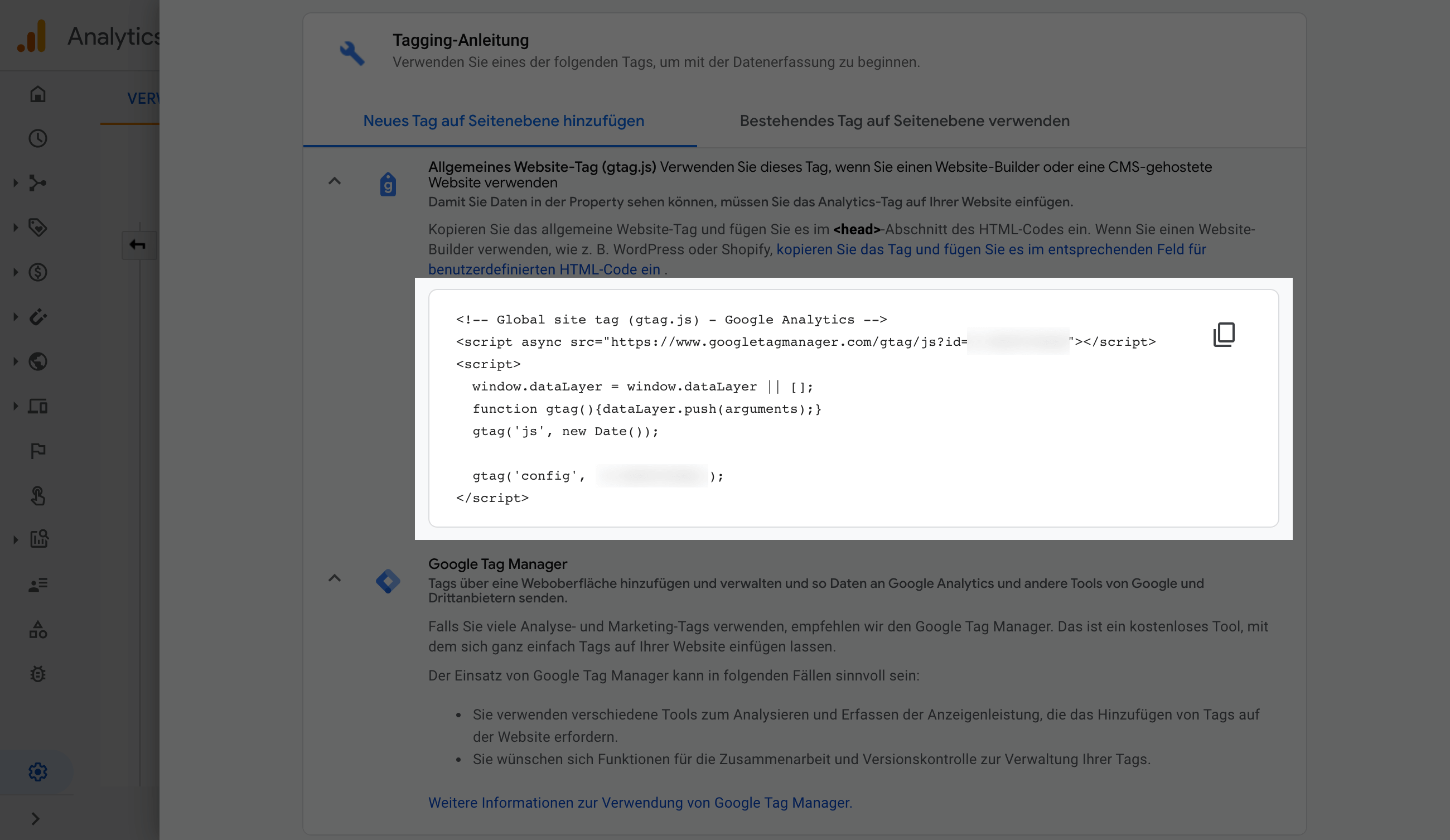 Dieser Schritt ist essenziell. Denn nur mit diesem Code gibst du Google gleichzeitig die Erlaubnis und den Befehl, deine Property bzw. den Traffic zu tracken und zu analysieren. Er befindet sich im Dateipfad Verwaltung > Datastreams > (Stream auswählen) > Tagging-Anleitung.