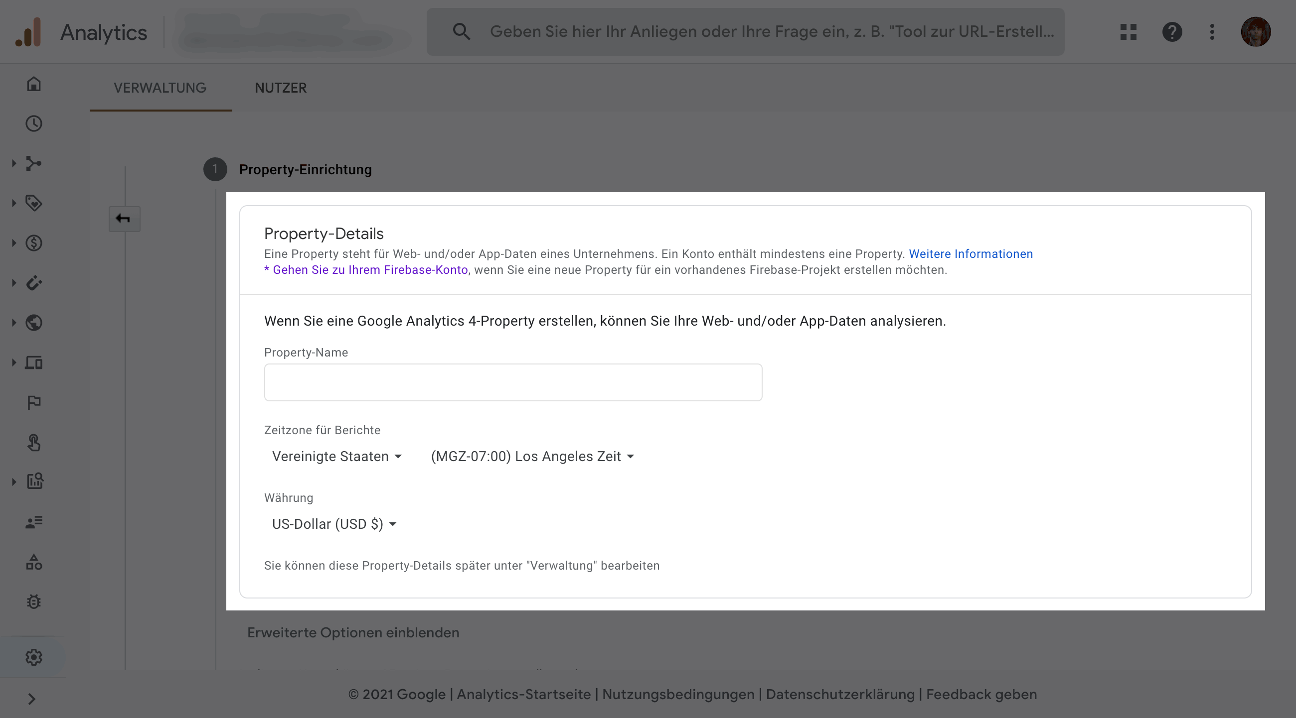 Eine Property ist eine Website oder App. Willst du später Properties hinzufügen, kannst du dies über den Menüpunkt Verwaltung und Property erstellen erledigen. Mit einem neuen GA4-Konto gelangst du direkt auf die Property-Einrichtung. Fülle das Formular mit einem Namen, einer Zeitzone und der gewünschten Währung aus.