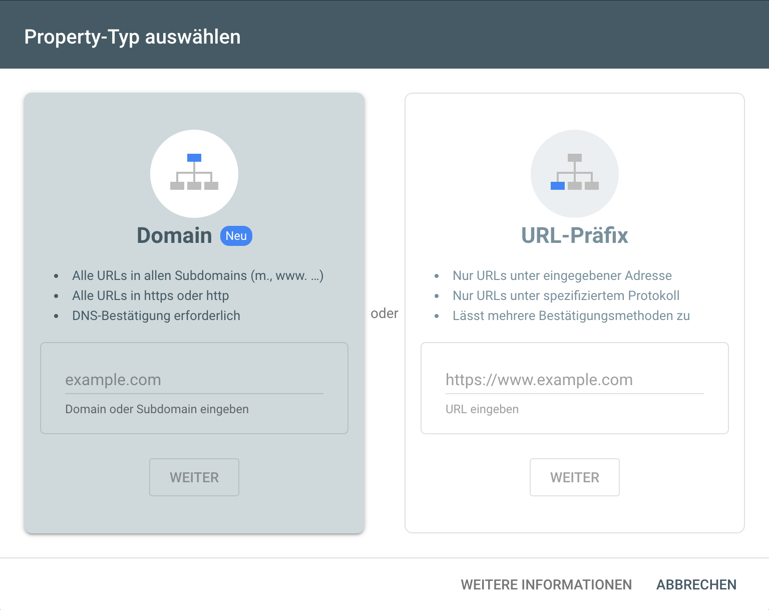 Die Inhaberschaft bei Domains bestätigst du über den DNS-Datensatz beim Domain Name Provider. Bist du selbst nur Betreiber, musst du dir die notwendigen Zugangsdaten beschaffen. Willst du einzelne Verzeichnisse registrieren („URL-Präfix“), hast du die Auswahl aus mehreren Bestätigungs-Methoden.
