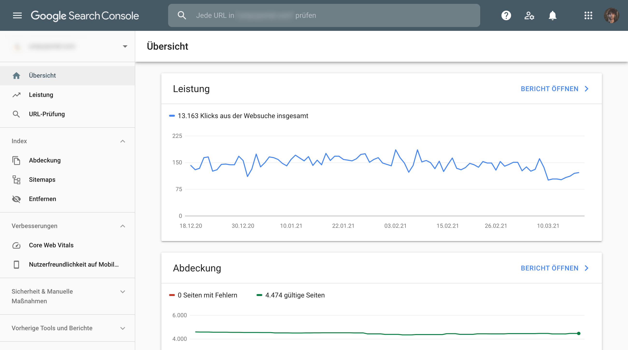 - Übersicht: Wenn du die Search Console öffnest, erwartet dich ein schneller Überblick über wichtige Details, zum Beispiel zur Leistung oder zu Verbesserungsmöglichkeiten.
