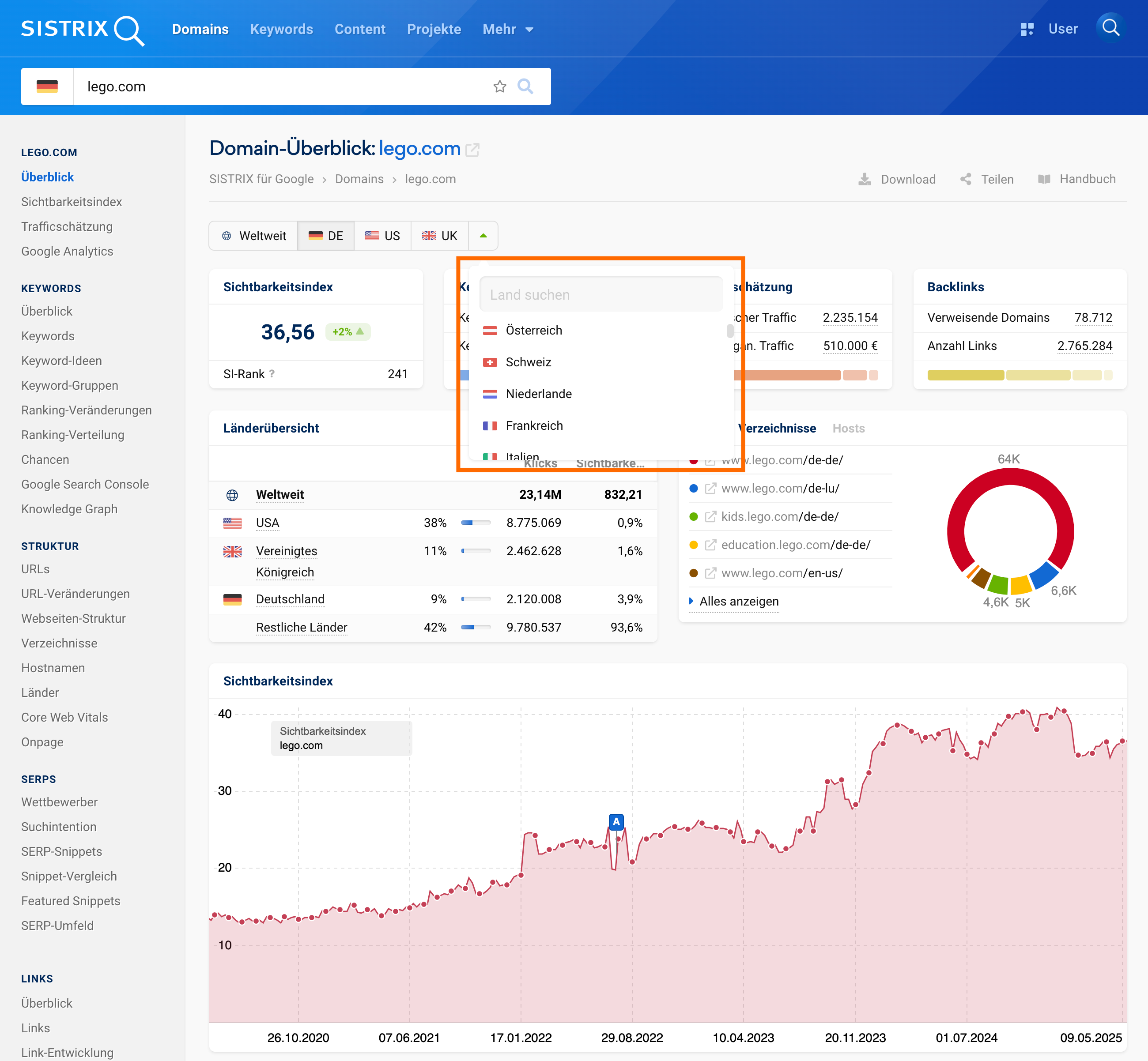Der SISTRIX Sichtbarkeitsindex bietet eine zentrale Metrik, um die Performance von Domains oder Subdomains in den jeweiligen Märkten zu verfolgen. Für internationale Projekte besonders relevant: