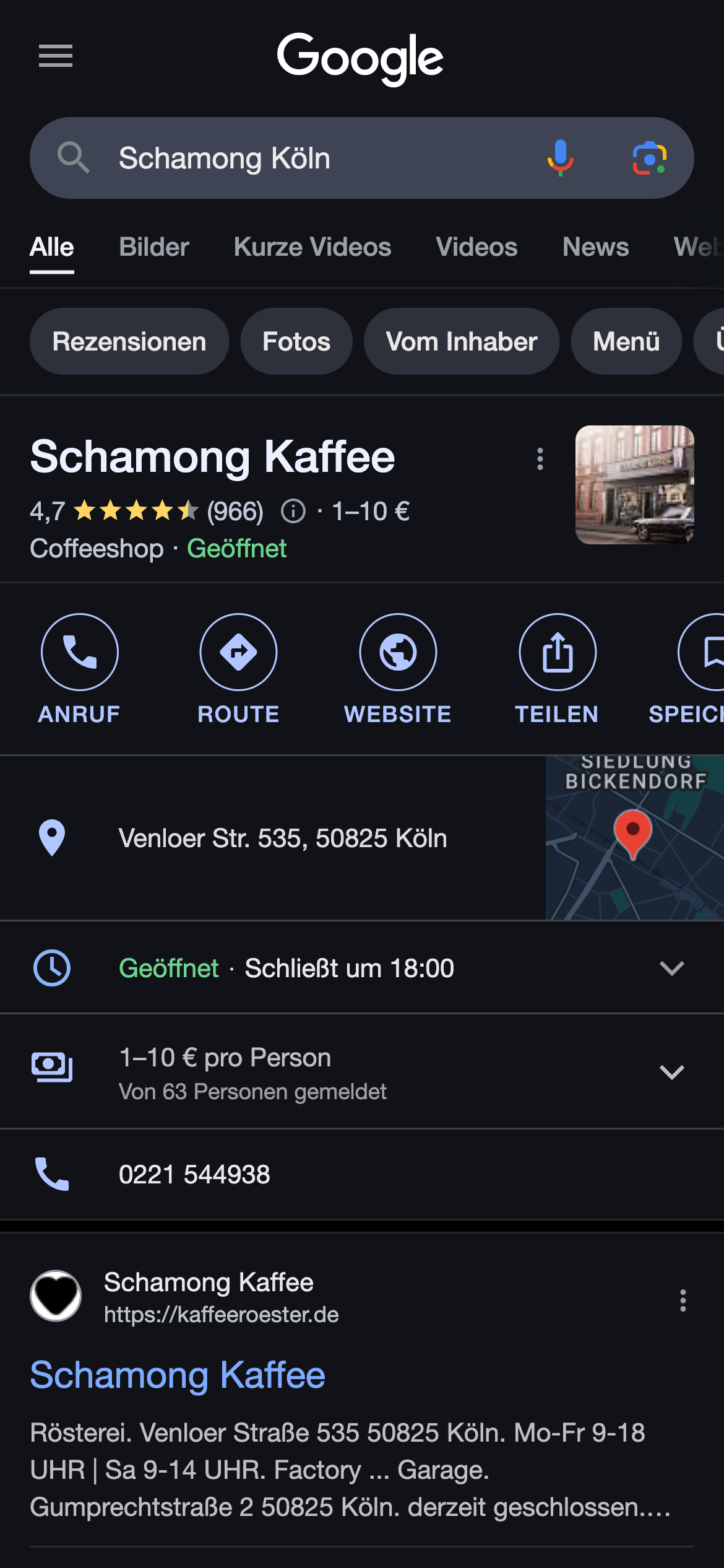 Das Google Unternehmensprofil verbessert die Sichtbarkeit in der lokalen Suche erheblich. Es wird besonders prominent angezeigt – oft über den organischen Suchergebnissen – und liefert sofort alle relevanten Informationen. Besonders bei mobilen Suchanfragen, wie zum Beispiel „Café in meiner Nähe“ oder „Klempner Hamburg“, sorgt ein optimiertes Profil dafür, dass das Unternehmen gefunden wird.