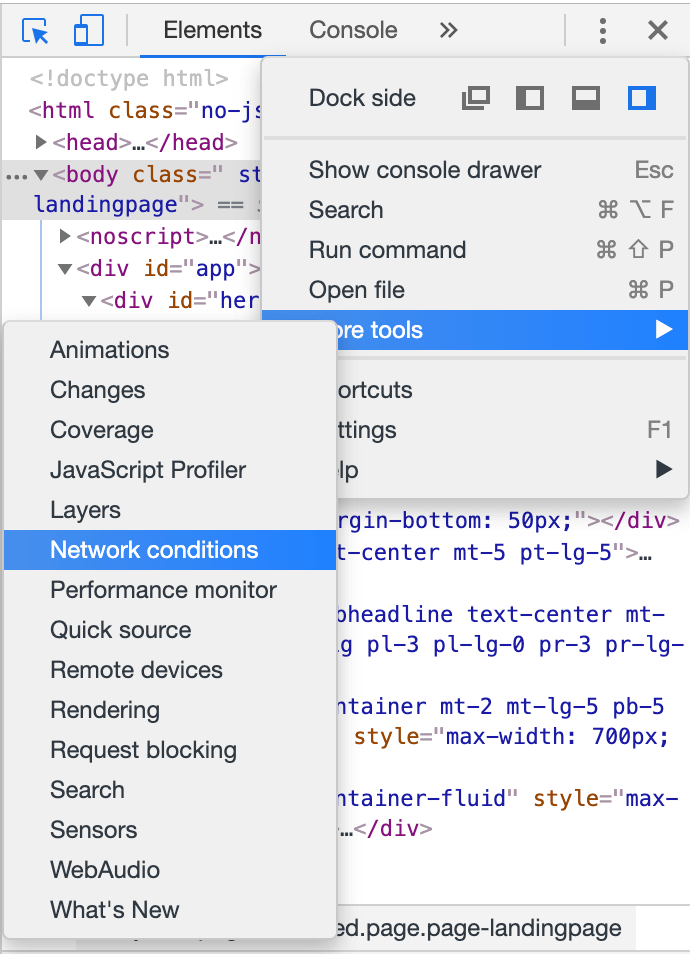 Klicke hier auf die , in der rechten oberen Ecke der Entwicklerkonsole 1, und wähle dort „More tools“ 2 und dann „Network conditions“ 3: