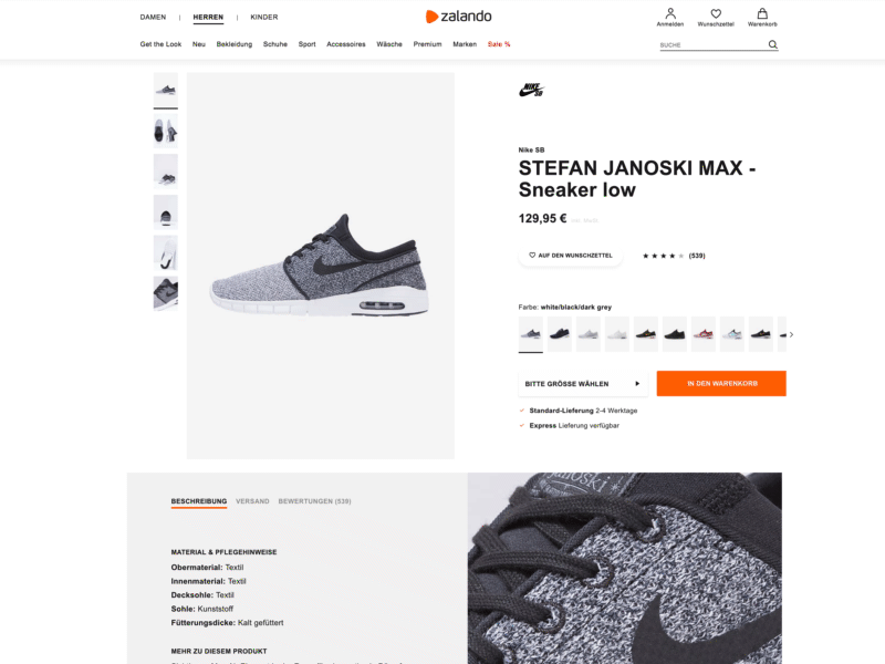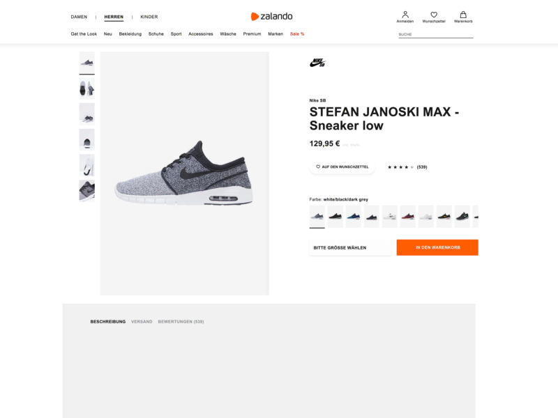 Ganz so bemerkenswert ist es bei den meisten Webseiten dann nicht. Schauen wir uns zum Beispiel eine Unterseite auf Zalando an.
