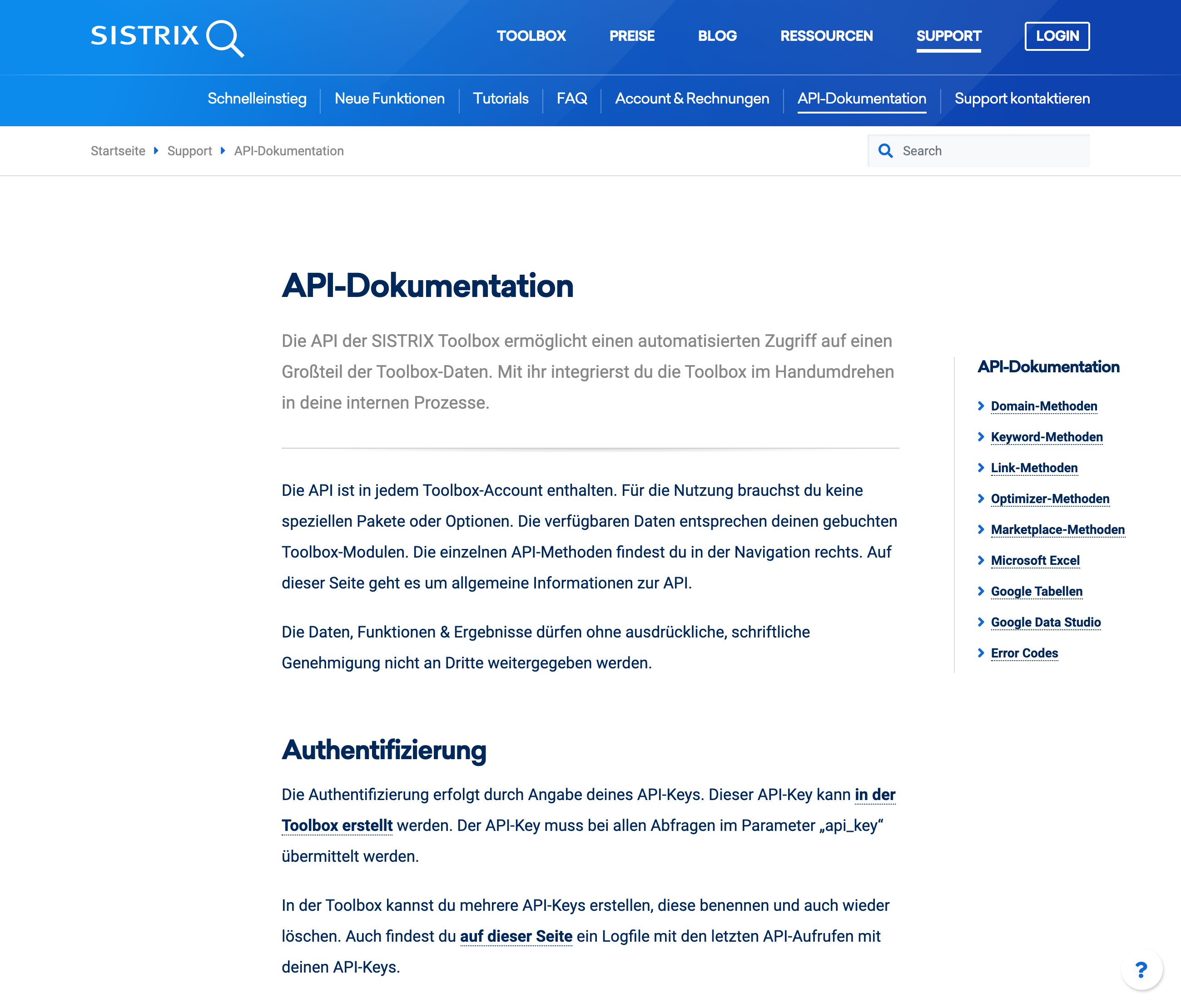 Ab dem „Plus“-Paket ist der API-Zugriff bereits in jedem SISTRIX-Account enthalten – vollkommen ohne Zusatzkosten oder benötigte Add-Ons. Einfach API-Key erzeugen und loslegen.