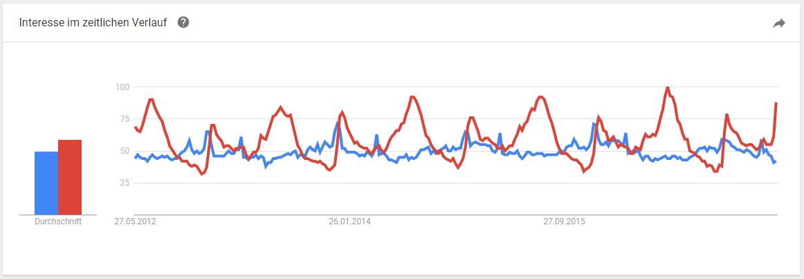 In den letzten fünf Jahren scheint der Suchbegriff ‘rezepte’ mit 50 Punkten im Vergleich zu ‘urlaub’ mit 59 Punkten relativ häufig gesucht zu sein.