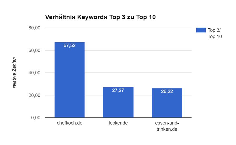 Aber: Relativ betrachtet kann lecker.de knapp 40% seiner rankenden Keywords in den Top 10 unter bringen – hingegen chefkoch.de “nur” 25%, wie in unten stehender Grafik erkenntlich ist.