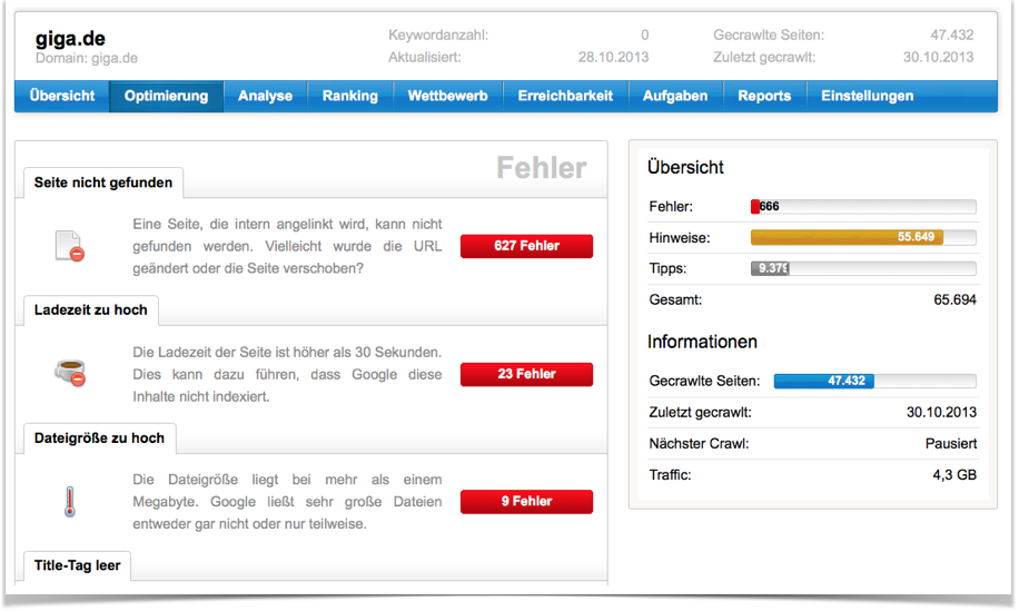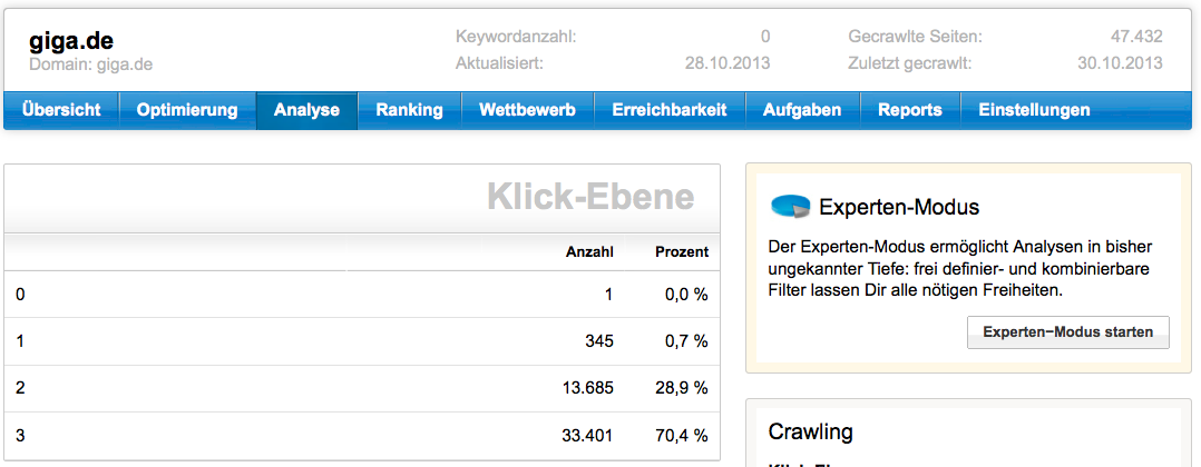 Für diesen Blogpost haben wir gestern im SISTRIX Optimizer für giga.de ein neues Projekt angelegt und bis heute hat er dort 47.432 Seiten gecrawlt.