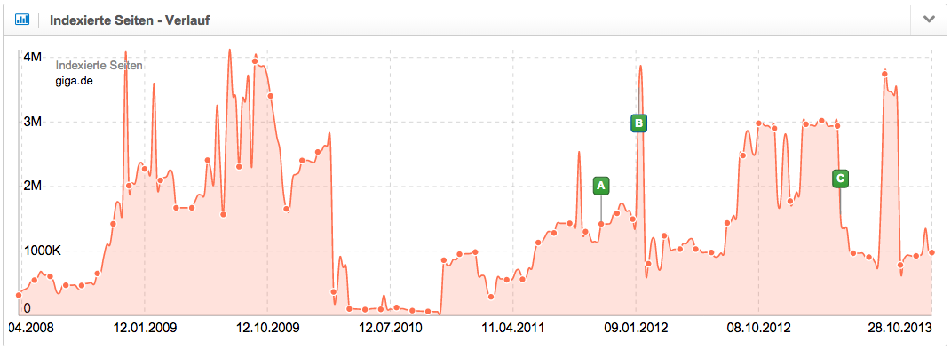 Seit dem Relaunch im April 2013 hat giga.de die Anzahl indexierter Seiten von rund 3 Mio. auf unter 1 Mio. heruntergefahren. Ein zwischenzeitlicher Anstieg der Anzahl indexierter Seiten im Zeitraum Juli bis August 2013 brachte den steilen Aufwärtstrend prompt ins Stottern. Erst als die Anzahl Seiten wieder unter 1 Mio. gesunken war, setzte der Aufwärtstrend wieder ein.