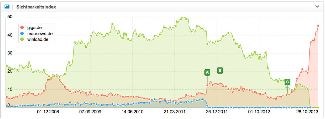 Zuletzt führte giga.de Anfang April 2013 (Ereignis-Pin C) einen Relaunch durch. Der Sichtbarkeitsindex ist seit diesem Zeitpunkt von 6,8 Punkte auf über 45 Punkte gestiegen und hat sich damit mehr als versechsfacht. Insbesondere für Betreiber von Newsportalen und Blogs ist giga.de damit ein sehr interessantes Best-Practice-Beispiel, bei dem man sich einige SEO-Techniken abschauen kann.