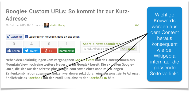 Diese Technik erinnert insgesamt ein wenig an die interne Verlinkung bei Wikipedia und der SEO-Erfolg des Lexikons sollte jedem bekannt sein. Auch wenn Wikipedia diese Form der internen Verlinkung wahrscheinlich nicht aus SEO-Gründen umgesetzt hat, sondern weil sie ebenfalls für die Nutzer sehr praktisch ist und gerne angenommen wird. Diese sehr mächtige SEO-Technik haben wir in dem Beitrag „Interne Verlinkung optimieren“ für eine tiefere Auseinandersetzung mit dem Thema ausführlich behandelt.