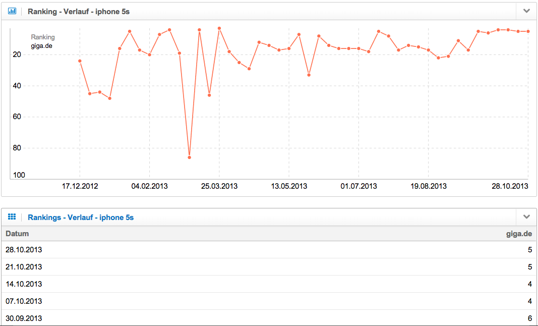 Diese Seiten heben sich angenehm von den vollautomatisierten Themenseiten anderer Websites ab. Man merkt, dass man sich hier ein paar Gedanken über die Inhalte gemacht hat, was die Nutzer interessieren könnte, um sie tiefer in die Website zu ziehen und weitere Klicks zu erzeugen. Offensichtlich war man auch bereit darin etwas Arbeit zu investieren. Für den Suchbegriff „iPhone 5s“ steht giga.de mit seiner Themenseite übrigens derzeit auf einem guten Platz 5 bei Google (Rankingentwicklung anzeigen).