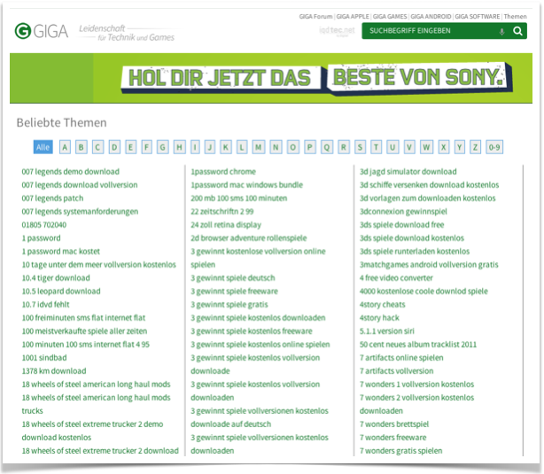 Im Header und Footer wird sehr intensiv auf beliebte Themen verlinkt und die Keywordlisten zu den einzelnen Themenseiten sind über eine A-Z-Liste mit Hunderten von Seiten leicht crawlbar.