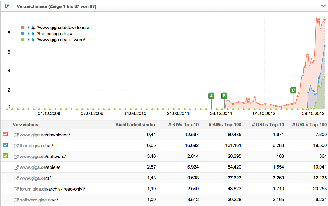 Bei giga.de wurden die Inhalte nach Kategorien wie z.B. Downloads, Software, Spiele und Unternehmen strukturiert und für jedes Keyword in das passende Verzeichnis eine entsprechende Themenseite erstellt. Eine Analyse der Sichtbarkeitsentwicklung der einzelnen Verzeichnisse von giga.de zeigt den Erfolg dieser Maßnahme seit dem Relaunch 2013.