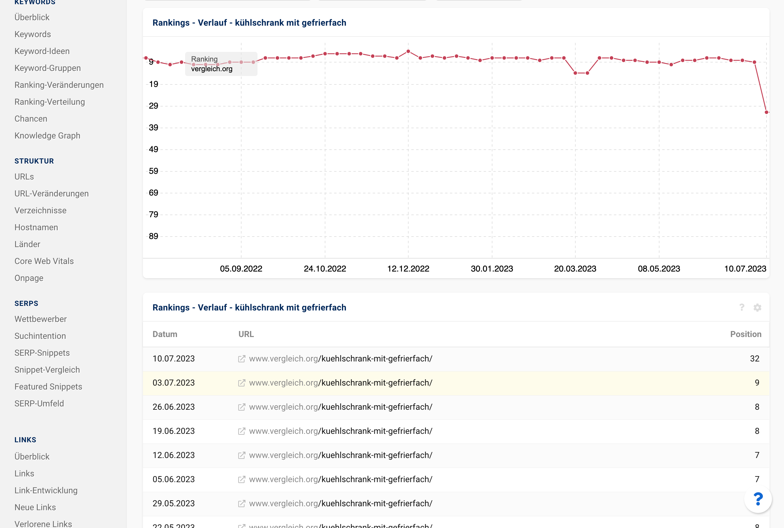 Auch wenn man etwas tiefer einsteigt, sehen die “Symptome” wie bei einem Core Update aus: für viele Begriffe geht das Ranking von der ersten Seite irgendwo nach hinten durch: mit entsprechendem Verlust an Sichtbarkeit, Aufmerksamkeit und am Ende auch Klicks.