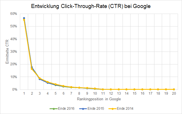 Wie man sieht, sieht man fast nichts. Im Ergebnis bedeutet das, dass sich die Verteilung der Klickwahrscheinlichkeit in den letzten 3 Jahren auf Basis unserer Daten (zur Datengrundlage später noch mehr) nur unwesentlich verändert hat. Da es im Diagramm so schwer zu entschlüsseln ist, hier noch die Zahlen in Tabellenform: