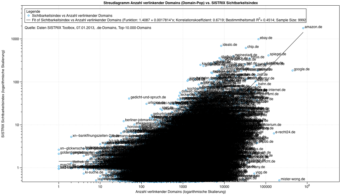 Für die eingezeichnete Trendlinie wurde eine Korrelation von 0,67 errechnet. Die Korrelation kann als gut bezeichnet werden. Das Bestimmtheitsmaß ist R^2=0,45. Das bedeutet, dass 45 Prozent der Streuung des Sichtbarkeitsindex durch die Domain-Pop erklärt werden können.