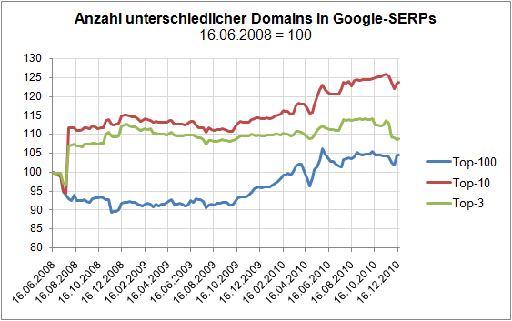 Zum Jahresende häufen sich in den SEO-Blogs die Jahresrückblicke. Häufig ganz interessant zu lesen, doch kommt bei mir dann regelmäßig die Frage auf: und was hat sich im letzten Jahr jetzt wirklich verändert? Sicherlich, für den einzelnen Seitenbetreiber machen Google-Veränderungen manchmal einen riesen Unterschied, in der Summe sind die SERPs allerdings „gefühlt“ recht stabil. Um zu überprüfen, ob mich das Gefühl trügt, habe ich in folgendem Diagramm die Anzahl der unterschiedlichen Domains in den Google-SERPS (getrennt für Top-3, Top-10 und Top-100) seit Mitte 2008 aufgetragen. Damit das vergleichbar bleibt, sind die Werte auf den 16.06.2008 mit 100 normiert: