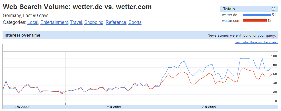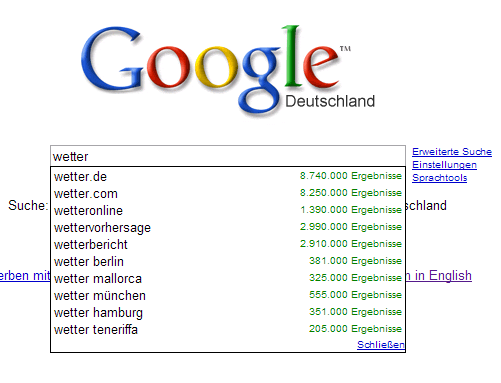 Als gutes Beispiel hierfür kann das Keyword ‚wetter‘ dienen – seit Jahren mit ordentlich Traffic ausgestattet und die Dynamik des Traffic der üblichen Wettbewerber untereinander dürfte relativ gering sein. Bei der Eingabe von Wetter auf der Google Startseite werden wetter.de und wetter.com als ersten Vorschläge geliefert. Guckt man sich jetzt bei Google Insights die Trafficwerte der beiden Domains an, so fällt auf, dass just zu dem Datum, an dem Google Suggest aktiviert wurde der Traffic sprunghaft angestiegen ist. Als Gegencheck noch ein Blick auf die Werte von Wetteronline.de, die nicht so prominent „beworben“ werden – hier ist kein Sprung zum Datum der Suggest-Einführung zu sehen. Diese Beobachtung gibt es auch bei zahlenreichen weiteren Keywords, ist also nicht nur auf das eine Keyword gemünzt.