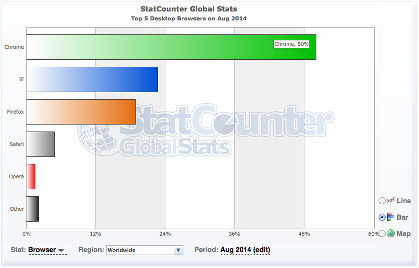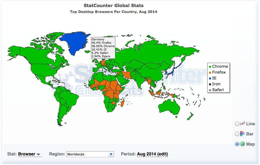 Deutschland ist eines der wenigen Länder auf der Welt, in denen der Chrome Browser noch nicht zum Marktführer geworden ist. Aber auch hierzulande liegt der Desktop-Marktanteil schon bei 28 Prozent. Nur der Firefox-Browser wird in Deutschland häufiger genutzt.